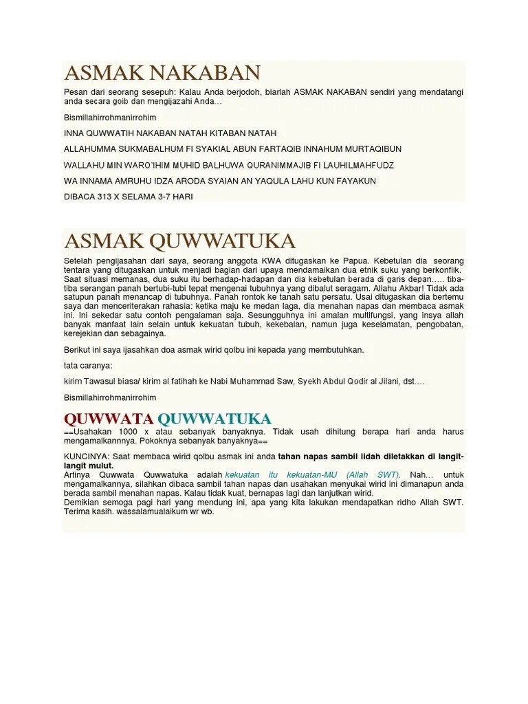 innama amruhu idza aroda syaian ayyaqulalahu kun fayakun.(apabila allah menghendaki segala sesuatu, maka cukup berkata:"jadi" Tidak di harus kan tawasul. Total 3 hari 3 malam adalah 9000x.) tata cara pengamalan asmak nakaban secara terperinci: "begini de, maksud dipanggil itu artinya meninggal dunia atau mati." Pertahanan dari berbagai macam serangan fisik/keroyokan/begal dll.